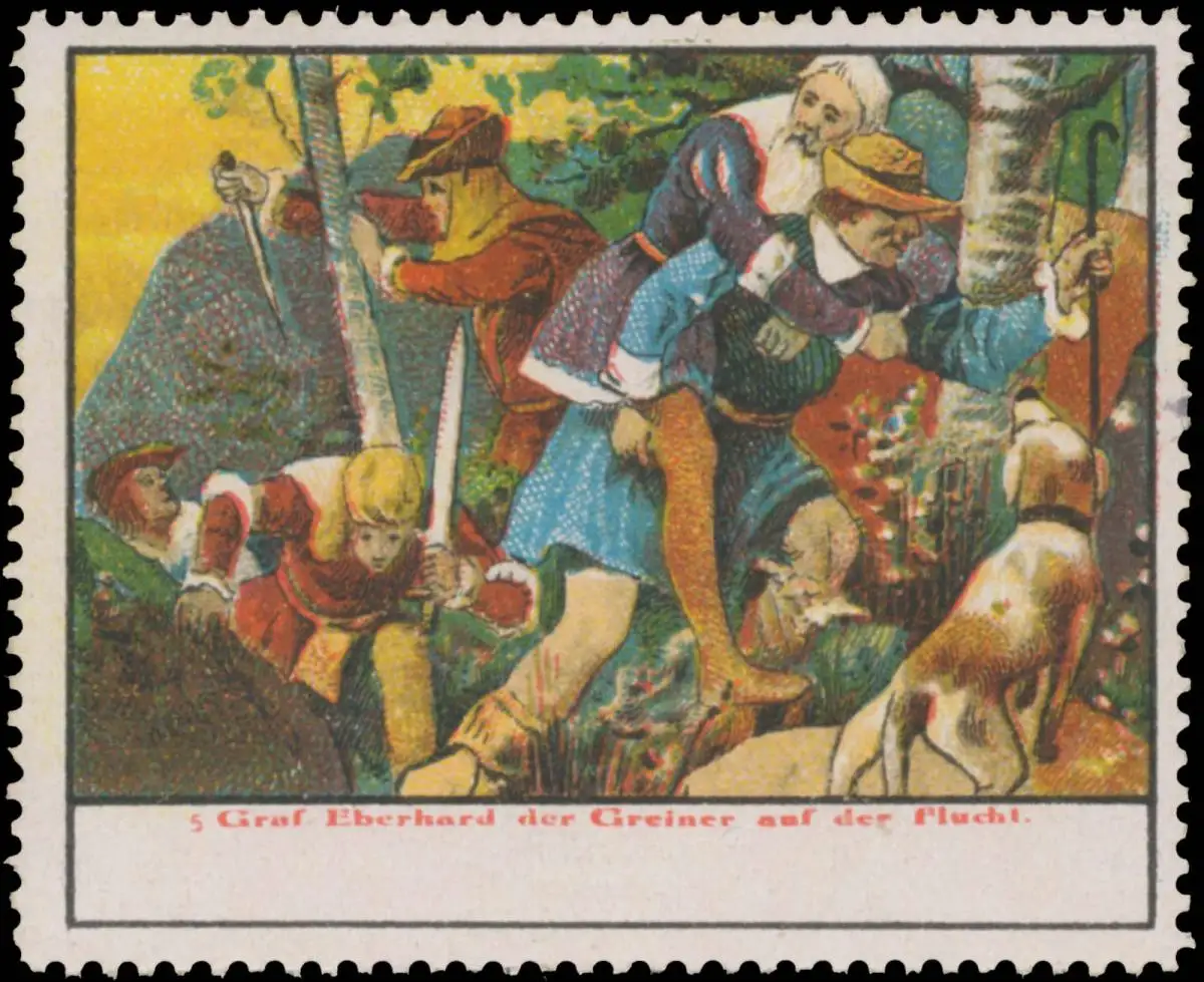 Graf Eberhard der Greiner auf der Flucht. 5, Größe/Zustand: 4x6 , guter Zustand, Original alte Reklamemarke die seinerzeit für die Werbung benutzt wurde