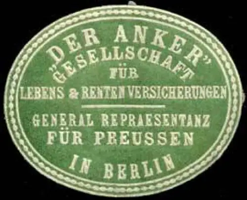 Gesellschaft für Lebens- & Rentenversicherungen-General Repraesentanz für Preussen. Grün, weiß, geprägt, Größe/Zustand: 3x4 , guter Zustand, Original Verschluss-Siegelmarke aus Papier welche früher von Behörden, Firmen etc. zum Versiegeln der Briefe benutzt wurden