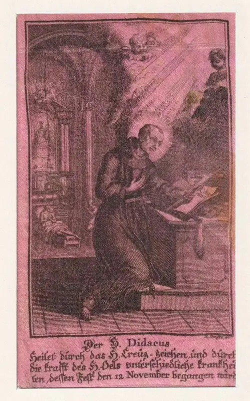 Bemerkungen: Zu sehen ist der Heilige Didacus (auch Didactus) von Alcalá (1400-1463), ein spanischer Laienbruder im Minoritenorden, vor einem kleinen Altar kniend. Im Hintergrund ist eine Hospitalsszene zu sehen,. Er widmete sich intensiv der Krankenpflege und soll zahlreiche Wunderheilungen vollbracht haben. Sein Gedenktag ist der 12. November. Unten rechts in der Platte signiert "J. Mansfed sc.", dabei dürfte es sich wohl um Johann Ernst Mansfeld (1739-1796), einen usprünglich aus Prag stammenden und später in Wien ansässigen Kupferstecher, handeln.
