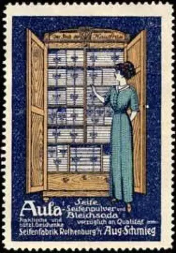 Aula - Seife, Seifenpulver, Bleichsoda vorzüglich an Qualität - Praktische und nützliche Gegenstände gratis, Wäscheschrank, Waschmittel , Größe/Zustand: 6x4 , guter Zustand, Original alte Reklamemarke die seinerzeit für die Werbung benutzt wurde