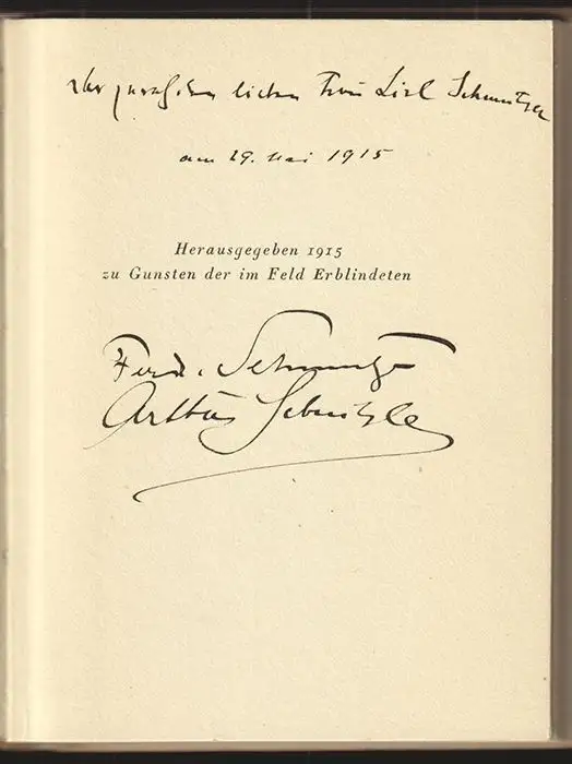 Bemerkungen: W.-G.² 34 - Mit eh. Signaturen von Ferdinand Schmutzer und Arthur Schnitzler sowie einer eigenh. Widmung Arthur Schnitzler an Frau Lisl [Alice?] Schmutzer. Nummer 2 von 200 numerierten u. signierten Exemplaren.