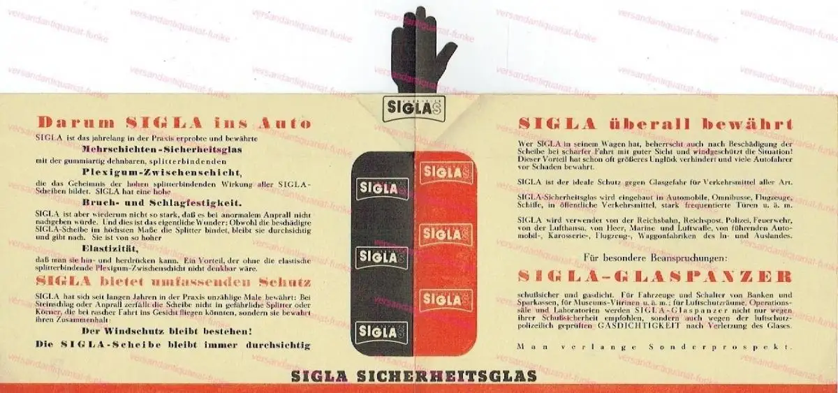 sehr guter Zustand, geringe Gebrauchs- und Alterungsspuren, original Reklame-Prospekt für Sigla-Sicherheitsglas für Kraftfahrzeuge Prospekt-Nr. 50.E.237 (Februar 1937), Papier, ca. 16,5 x 12, 4 Seiten
