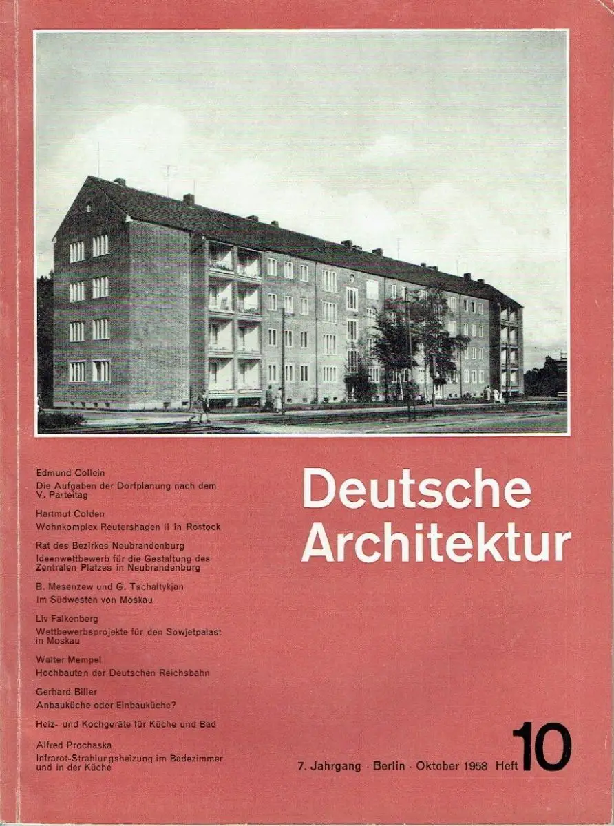sehr guter Zustand, geringe Gebrauchs- und Alterungsspuren: Rücken oben und unten je ca. 2 cm aufgerissen - Deckel oben mit kleinem Eselsohr, Prof. Dipl.-Architekt BDA Edmund Collein: Die Aufgaben der Dorfplanung nach dem V. Parteitag - Architekt BDA Dipl.-Ing. Hartmut Colden: Wohnkomplex Reutershagen II in Rostock (4 Seiten) - Architekt BDA Kurt Tauscher und Architekt Martin Halwas: Wohnungsbau der AWG Neptun in Rostock, Hamburger Straße - Architekt BDA A. Renner und Architekt K. Laurich: Neue Wohnhäuser in Bitterfeld - Entwurfsbüro für Hochbau Halle: Wohnhäuser in der Lutherstadt Wittenberg, Erich-Mühsam-Straße - Rat des Bezirkes Neubrandenburg, Bezirksbauamt: Ideenwettbewerb für die Gestaltung des Zentralen Platzes In Neubrandenburg (7 Seiten) - B. Mesenzew und G. Tschaltykjan: Im Südwesten von Moskau (3 Seiten) - Liv Falkenberg: Wettbewerbsprojekte für den Sowjetpalast in Moskau - Liv Falkenberg: Überdachung des Dynamo-Stadions in Moskau - Architekt BDA Walter Mempel: Hochbauten der Deutschen Reichsbahn (10 Seiten) - Architekt Wilfried Stallknecht: Einfamilienhäuser 1958 - Bauingenieur Günter Mann: Beispiel für die Anwendung des Takt- und Fließverfahrens im Bauwesen - Entwurfsbüro für Hochbau Plauen: Dorfzentrum in Wiedersberg im Vogtland - Jan Stulinski: Die Proportionen der klassischen Architektur (4 Seiten) - Ingenieur Gerhard Biller: Anbauküche oder Einbauküche? - Heiz- und Kochgeräte für Küche und Bad (4 Seiten) - Ingenieur Alfred Prochaska: Infrarot-Strahlungsheizung im Badezimmer und in der Küche - Architekt BDA:Boris Martens: Kombinierte Spül- und Ausgußbecken für Haushaltsküchen (Boma-Spüle) - Dr.-Ing. G. Richter: Stahlbetonshedschalen und Industrialisierung - Ing. V. Vesely: Welche Faktoren bestimmen die Größe von Grünflächen in Städten? - Prof. Dr. med. R. Neubert: Der Schulbau und seine Forderungen - Architekt BDA Johannes Hübner: Warum geht die Modernisierung der Küche nicht vorwärts?, kartoniert, ca. 23 x 31, 60 Seiten mit zahlreichen Bildern