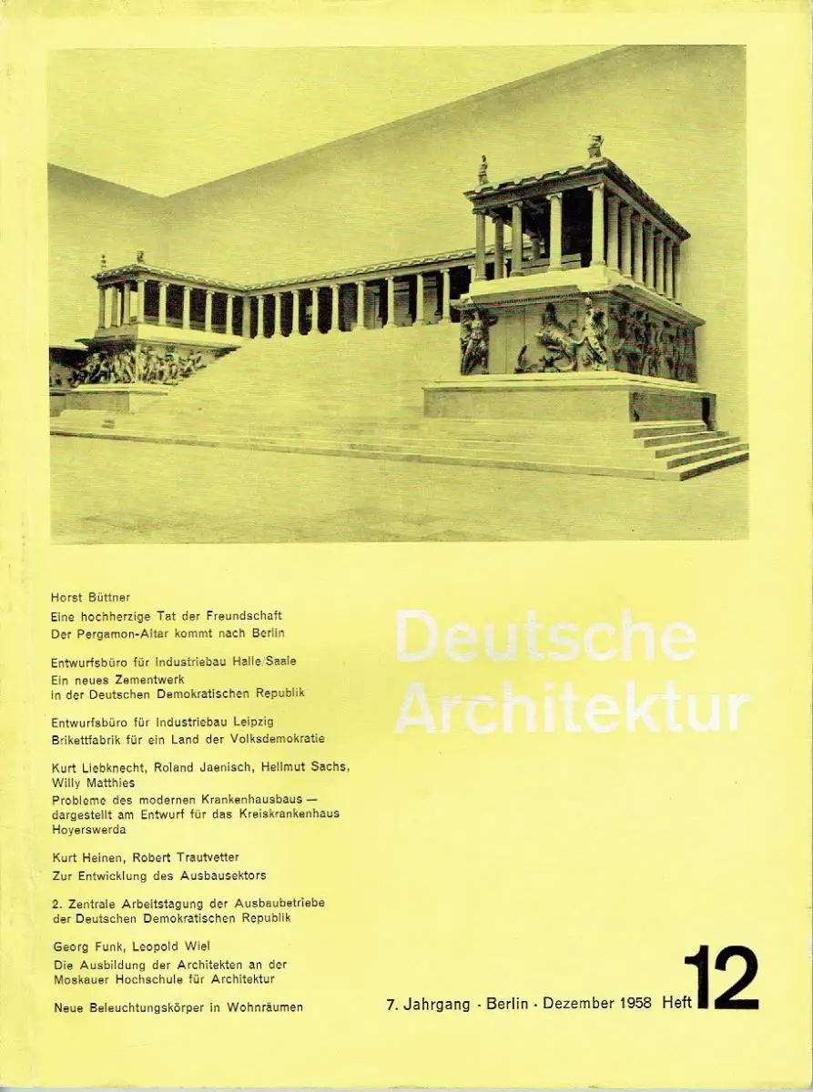 sehr guter Zustand, geringe Gebrauchs- und Alterungsspuren: Umschlag und Seiten teils etwas eselsohrig - Rücken minimal aufgerissen, Eine hochherzige Tat der Freundschaft — Der Pergamon-Altar kommt nach Berlin (3 Seiten) - Entwurfsbüro für Industriebau Halle/Saale: Ein neues Zementwerk in der Deutschen Demokratischen Republik (8 Seiten) - Entwurfsbüro für Industriebau Leipzig, Brigade 3: Bauing. Gerhard Wiesener, Bauing. Albert Höhne, Bauing. Roland Brandt, Bauing. Heinz Körner: Brikettfabrik für ein Land der Volksdemokratie (4 Seiten) - Johannes Schreinert: Individualismus im Industriebau oder Erfüllung der Volkswirtschaftspläne - Prof. Dr.-Ing. Kurt Liebknecht, Dipl.-Ing. Roland Jaenisch, Architekt BDA Dipl.-Ing. Hellmut Sechs, Architekt BDA Willy Matthies: Probleme des modernen Krankenhausbaus — dargestellt am Entwurf für das Kreiskrankenhaus Hoyerswerda (6 Seiten) - Landschaftsarchitekt Reinhold Lingner: Feriensiedlung am Wasser - Architekt Rudolf Flügel, Entwurfsbüro für Hochbau Finsterwalde: Freiwillige Helfer am Werk — Freiluft-Kunsteisbahn Weißwasser O/L (4 Seiten) - Prof. Hanns Hopp: Erneuerte Handwerkskunst - Neue Beleuchtungskörper in Wohnräumen - Architekt BDA Gregor Düsterhöft: Die ökonomische Anwendung der Plattenbauweise beim Wohnungsbau in Moskau - Architekt BDA Dipl.-Ing. H. Colden: Ein Besuch bei Giprogor, Moskau, Juli 1958 - Dipl.-Ing. Karl Sommerer: Bauausstellung in Moskau - Prof. Georg Funk, Prof. Leopold Wiel: Die Ausbildung der Architekten an der Moskauer Hochschule für Architektur (3 Seiten) - Dipl.-Wirtschaftler Kurt Heinen, Architekt Robert Trautvetter: Zur Entwicklung des Ausbausektors (3 Seiten) - 2. Zentrale Arbeitstagung der Ausbaubetriebe der DDR: Berichte über die Tätigkeit der Arbeitsgruppen (4 Seiten) - Ing. Hans Thieme: Der technisch-wirtschaftlich zweckmäßige Einbau der Holzfenster - Architekt Wolfgang Lötsch: Bemerkungen zur Planung Rostock-Reutershagen 11 - Ing. Gerhard Biller: Gedanken zum Entwurf der Stalinallee vom Strausberger Platz bis zum Alexanderplatz - Architekt BDA Dipl.-Ing. Ernst Mauke: Antwort aus Jena, kartoniert, ca. 23 x 31, 58 Seiten mit zahlreichen Bildern