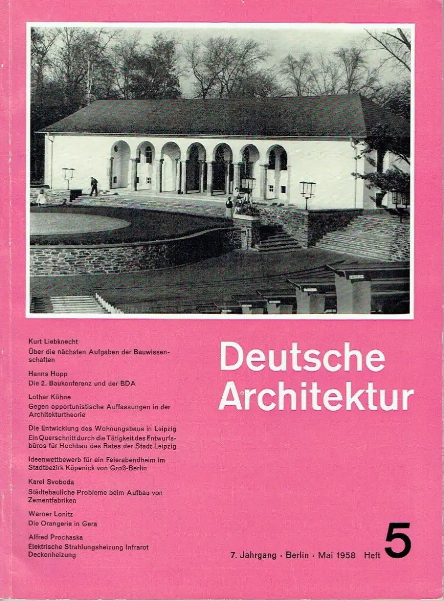 sehr guter Zustand, geringe Gebrauchs- und Alterungsspuren: Rücken minimal aufgerissen - Umschlag und Seiten teils etwas eselsohrig, Prof. Dr. Kurt Liebknecht: Über die nächsten Aufgaben der Bauwissenschaften - Prof. Hanns Hopp: Die 2. Baukonferenz und der BDA - Lothar Kühne: Gegen opportunistische Auffassungen in der Architekturtheorie - Die Entwicklung des Wohnungsbaus in Leipzig - Ein Querschnitt durch die Tätigkeit des Entwurfsbüros für Hochbau des Rates der Stadt Leipzig (10 Seiten) - Architekt BDA Herwig Hrussa, Architekt BDA Eberhard Leuthold, Ing. Fritz Retzloff: Wohnstadt Calbe/Saale, Block 15a - Entwurfsbüro für Hochbau Potsdam: Wohnungsbau Premnitz „Am Dachsberg" (3 Seiten) - Ideenwettbewerb für ein Feierabendheim im Stadtbezirk Köpenick von Groß-Berlin (4 Seiten) - Dipl.-Ing. Herbert Cammradt: Gemischtwarenverkaufsstellen und Landwarenhäuser (3 Seiten) - Dr.-Ing. Karel Svoboda: Städtebauliche Probleme beim Aufbau von Zementfabriken (4 Seiten) - Architekt H. Busse: Die Frellichtbühne im Kulturpark Zwickau (3 Seiten) - Dipl.-Architekt BDA Werner Lonitz: Die Orangerie in Gera (6 Seiten) - Alfred Prochaska: Elektrische Strahlungsheizung Infrarot Deckenheizung - Zum 76. Geburtstag von Hans Richter, Dresden - Fragen an eine theoretische Konferenz - Bauingenieur Wolfgang Wolter: „Produktivkraft — Wissenschaft" in der Praxis - Architekt BDA Hans Drost: Der individuelle Wohnungsbau auf dem Lande - Dr.-Ing. P. Beyersdorfer, Architekt BDA A. Pohl: Baustoff Glas, kartoniert, ca. 23 x 31, 60 Seiten mit zahlreichen Bildern