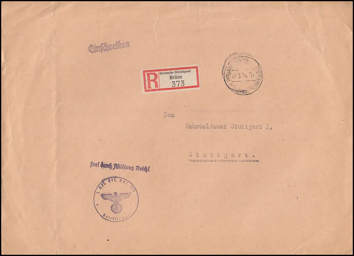 Deutsche Dienstpost Böhmen-Mähren R-Bf. BRÜNN 7.3.40 nach STUTTGART 8.3.40