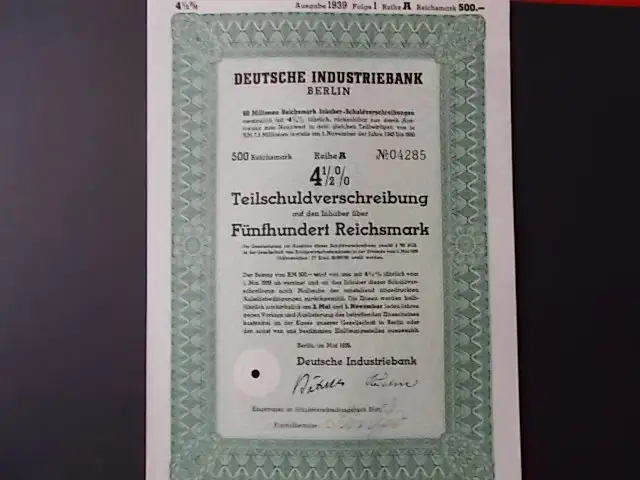 Deutsche Industriebank Berlin 1939 4,5% Anleihe 500 Reichsmark