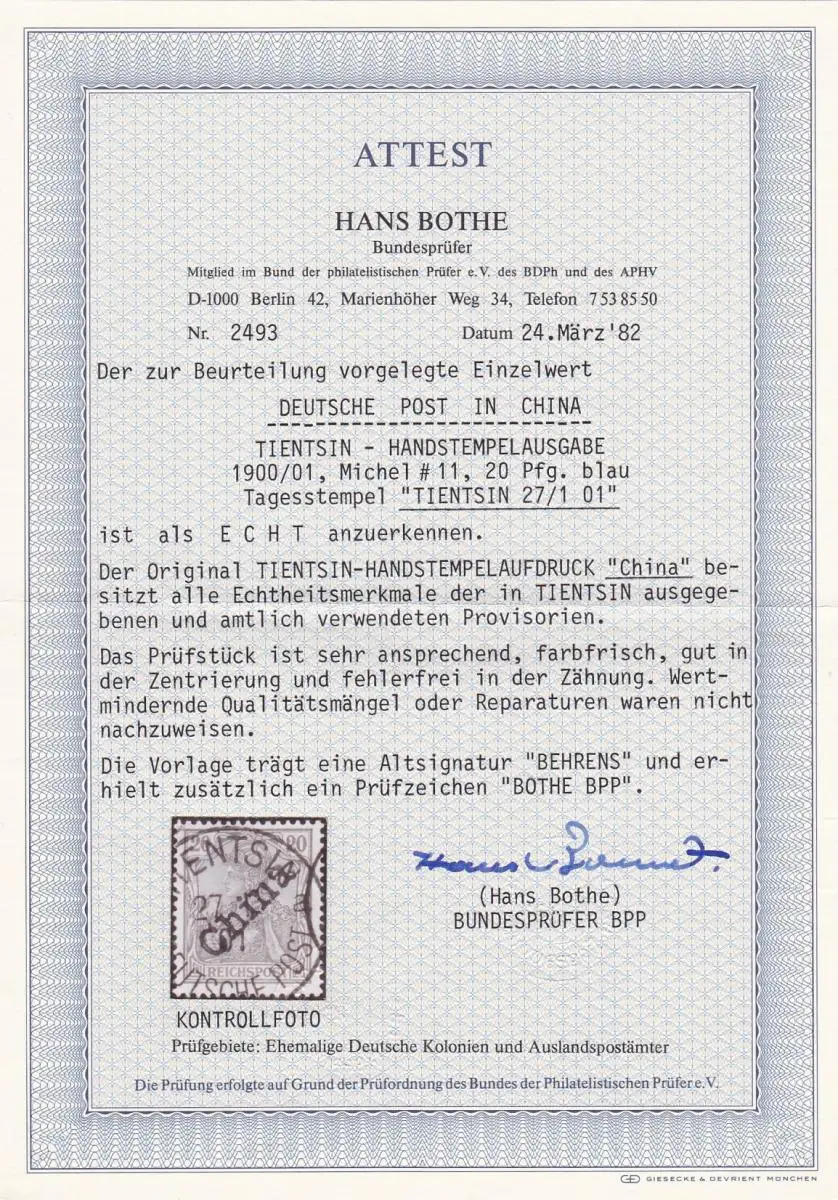 Deutsche Kolonien: China: MiNr. 11 , Tientsin 1901, gestempelt, BPP Attest