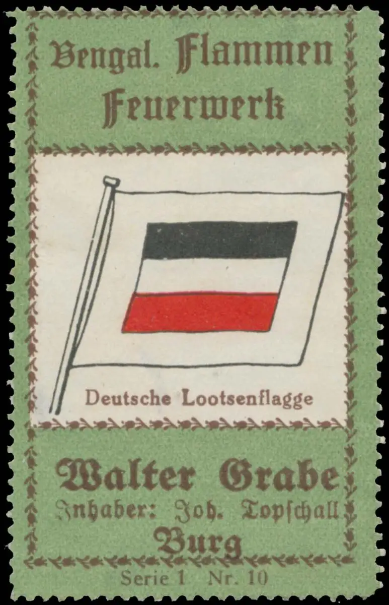 Bengal. Flammen Feuerwerk, Drogerie Walter Grabe, Inhaber: Joh. Topschall, Serie 1, Nr. 10, Größe/Zustand: 7x4 , leicht beschädigt, Original alte Reklamemarke die seinerzeit für die Werbung benutzt wurde