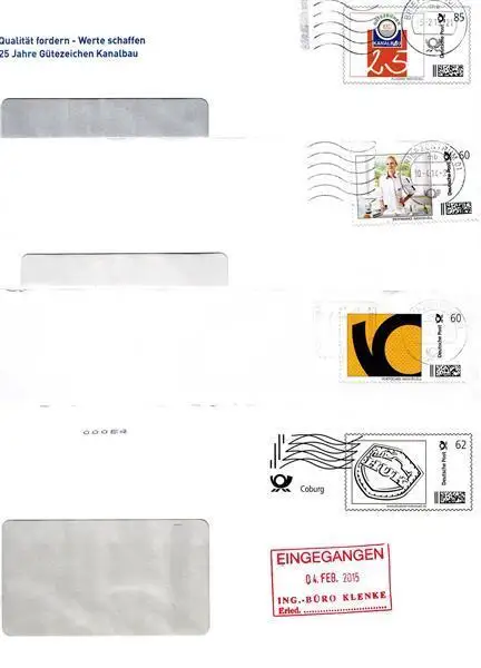 • MichSeite Deutsche Post: LOT mit 4 personalisierten Briefmarken, gestempelt Beschreibung \nAusgabeland: Bundesrepublik Deutschland \nPostdienstleister: Deutsche Post, Bonn \nAusgabeanlass: personaliserte Briefmarkenausgaben "Deutsche Post", "Berlinerblau GmbH" und 2 Ganzsachen "HUK", "RAL Gütezeichen Kanalbau" Katalognummer: - Ausgabedatum: - Nominale: 0,60 EUR (2 x), 0,62 EUR (1 x), 0,85 EUR (1 x) \nTyp: - \nErhaltung: selbstklebend, zähnungsartig gestanzt, gestempelt (4 Bedarfsbelege) \nHinweis: LOT mit 2 personaliserten Briefmarken und 2 Ganzsachen
