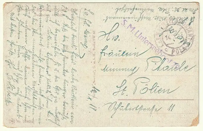 Bemerkungen: Gelaufen m. Stempel:S.M.Unterseeboot 28. Einzeiler violett. KALIS1-P.160 neben K.u.K. MFPA/14.X.18/Pola.