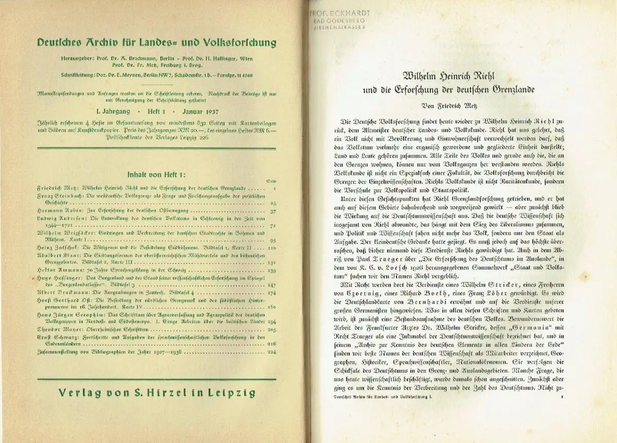 guter Zustand, geringe Gebrauchs- und Alterungsspuren: privat gebunden - erste Textseite mit altem Besitzerstempel - Seiten überwiegend sauber und ordentlich, selten gering stockfleckig - etwas unfrischer Geruch, die Zahlen am Ende der Zeilen sind die Seitenzahlen, auf denen die Artikel beginnen - Friedrich Metz: Wilhelm Heinrich Riehl und die Erforschung der deutschen Grenzlande. 1 - Franz Steinbach: Die westdeutsche Volksgrenze als Frage und Forschungsaufgabe der politischen Geschichke. 25 - Hermann Aubin: Zur Erforschung der deutschen Ostbewegung. 37 - Ludwig Andresen: Die Entwicklung des deutschen Volkstums in Schleswig in der Zeit von 1544-1721. 71 - Wilhelm Weizsäcker: Eindringen und Verbreitung der deutschen Stadtrechte in Böhmen und Mähren. 95 - Heinz Zatschek: Die Witigonen und die Besiedelung Südböhmens. 110 - Adalbert Klaar: Die Siedlungsformen des oberösterreichischen Mühlviertels und des böhmischen Grenzgebietes. 131 - Hektor Ammann: 70 Jahre Sprachenzählung in der Schweiz. 139 - Hugo Hossinger: Das Burgenland und der Stand seiner wissenschaftlichen Erforschung im Spiegel des »Burgenlandatlasses«. 147 - Albert Brackmann: Die Ausgrabungen in Zantoch. 174 - Horst Gotthard Ost: Die Besiedlung der nördlichen Grenzmark und des südöstlichen Hinterpommerns im 16. Jahrhundert. 180 - Hans Jürgen Seraphim: Das Schrifttum über Agrarverfassung und Agrarpolitik der deutschen Volksgruppen in Nordost- und Südosteuropa. Einige Arbeiten über die baltischen Länder. 194 - Theodor Mayer: Oberrheinisches Schrifttum. 205 - Ernst Schwarz: Fortschritte und Aufgaben der sprachwissenschaftlichen Volksforschung in den Sudetenländern. 216 - Zusammenstellung von Bibliographien der Jahre 1927-1936. 224, Leinen, ca. 18 x 26,5, 256 Seiten mit 4 Bildtafeln und 4 Karten
