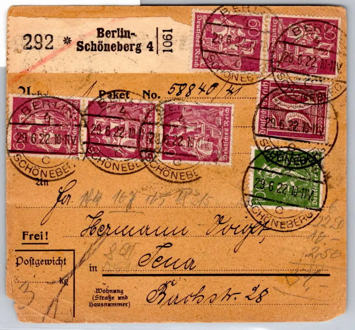 50 Pfennig Ziffer, 30 Pfennig Ziffer per 15, 60 Pfennig Schmied per 5 +100 Pfennig Bergarbeiter als Mischfrankatur auf Paketkarte am 29.6.1922 von Berlin nach Jena gelaufen.