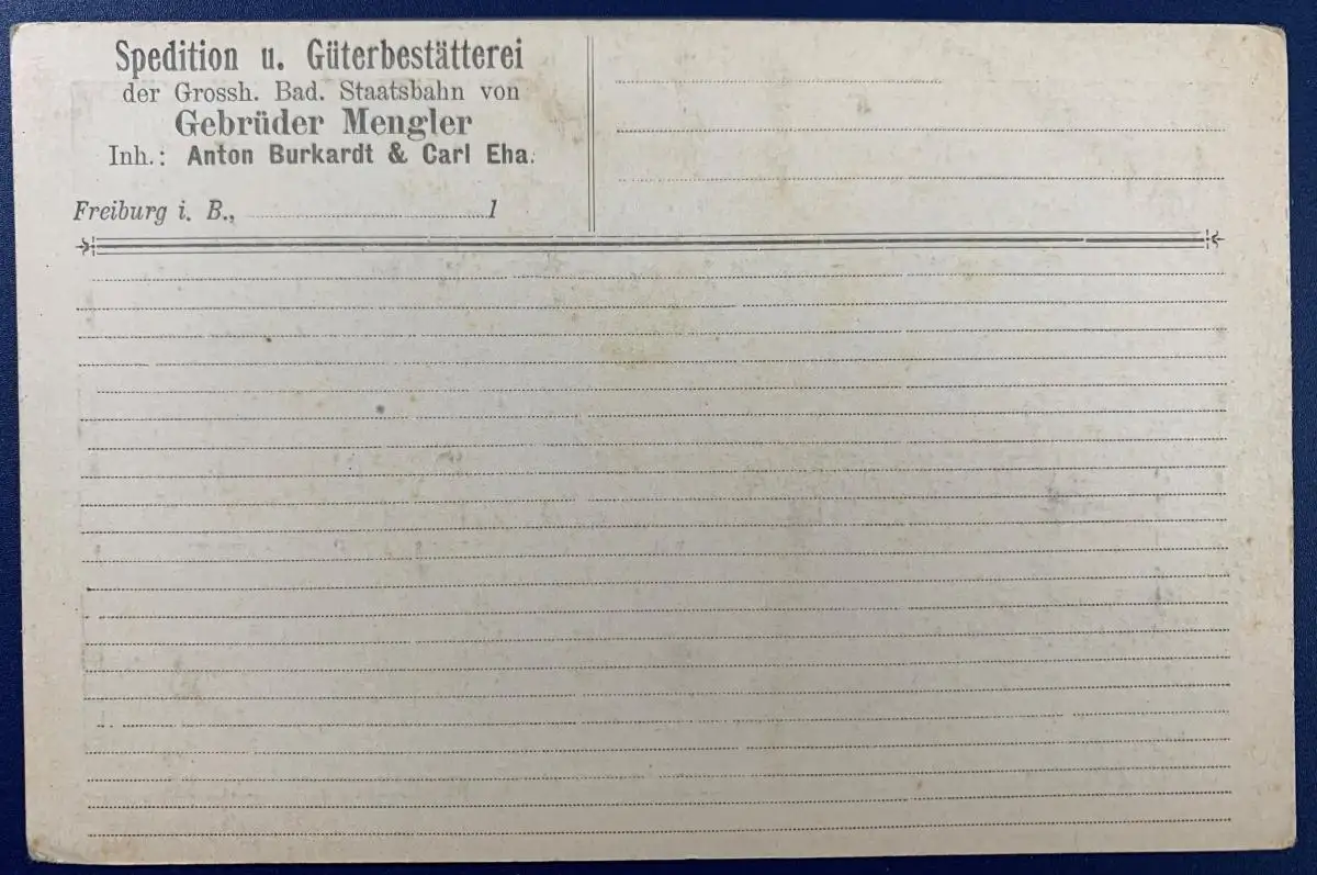 Auslandspostkarte Reichspost mit rückseitigem Firmenaufdruck "Spedition u. Güterbestätterei, Freiburg i.B."