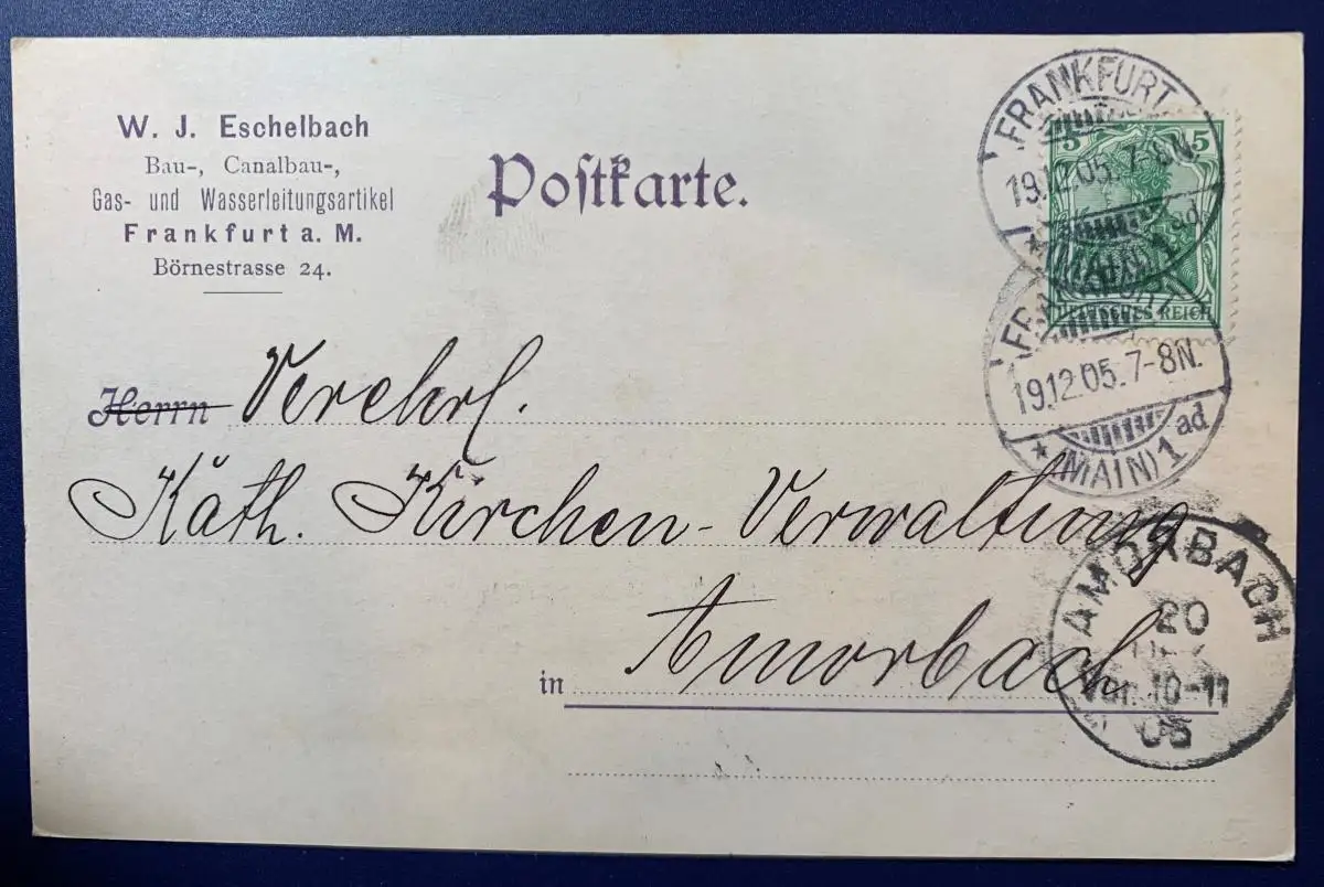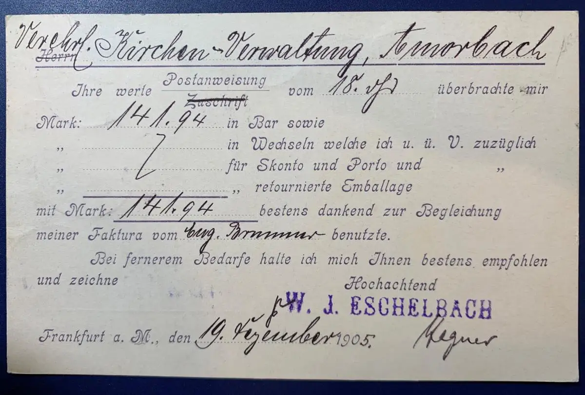 Die Karte (frankiert mit MiNr. 85 I) ist mit Poststempel vom 19.12.1905 von Frankfurt a.M. nach Amorbach in Unterfranken gelaufen. Auf der Rückseite befindet sich eine vorgedruckte Empfangsbestätigung mit welcher vom Absender der Zahlungseingang einer Postanweisung bestätigt wurde.