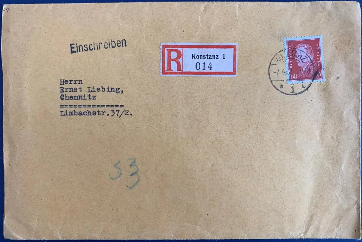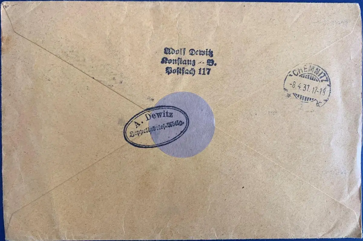 Einschreiben, Deutsches Reich, frankiert mit Mi.Nr. 421, gelaufen mit Poststempel vom 07.04.1931 von Konstanz nach Chemnitz (Ankunftstempel 08.04.1931), Format 197 x 130 mm, Brief ist sehr gut erhalten.
