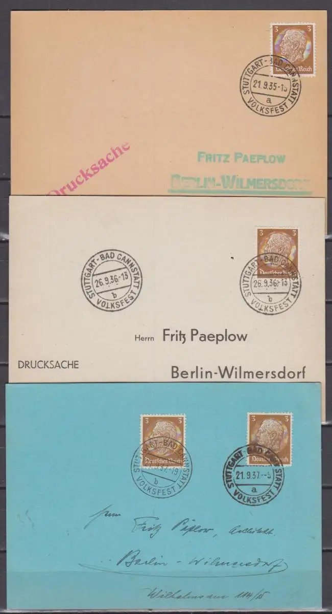 Dt.Reich SSt Stuttgart Bad Cannstatt / Volksfest Jahre 1935,1936 und 1937 auf 3 Stempelkarten mit 513