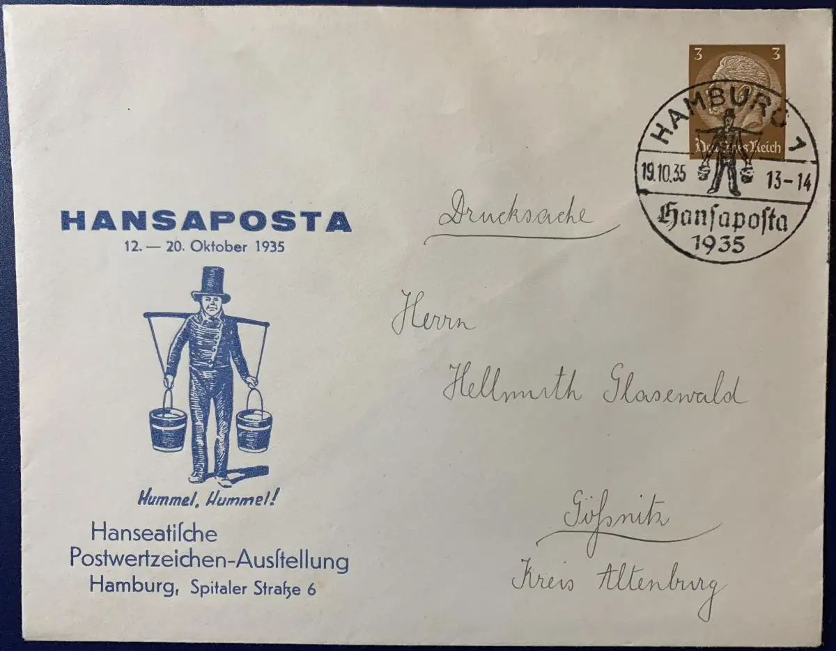Ganzsache Privat Briefumschlag, Hansaposta Hamburg, frankiert (aufgedruckt) mit Mi.Nr. 513 (Hindenburg 3 Pfg.), gelaufen mit Sonderstempel vom 19.10.1935 von Hamburg nach Gößnitz, Thüringen. Briefformat: 163 mm x 128 mm, Brief ist sehr gut erhalten, sauberer Stempel.