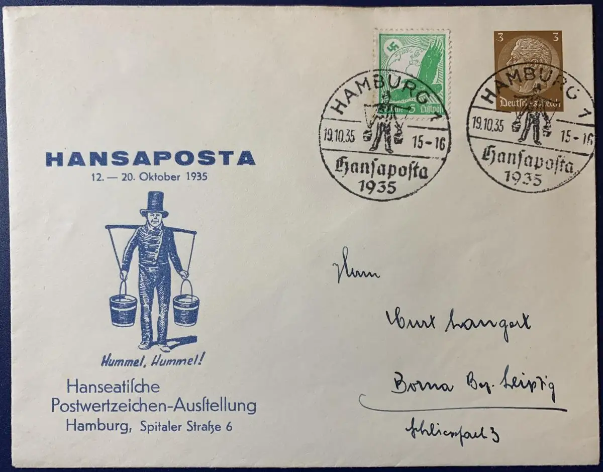 Ganzsache Privat Briefumschlag, Hansaposta Hamburg, frankiert (aufgedruckt) mit Mi.Nr. 513 (Hindenburg 3 Pfg.), Zusatzfrankatur Mi.Nr. 529, gelaufen mit Sonderstempel vom 19.10.1935 von Hamburg nach Borna, Bezirk Leipzig. Briefformat: 163 mm x 128 mm, Brief ist sehr gut erhalten, sauberer Stempel.
