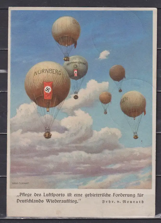 Dt.Reich Propagandakarte " Pflege des Luftsports ist eine gebieterische Forderung für Deutschlands Wiederaufstieg " Abb Ballone Nürnberg/Hermann Göhring mit Symbolflaggen, frankiert mit 644 und SSt Chemnitz-Südkampfbahn Gordon-Benett Ausscheidungsfahrt