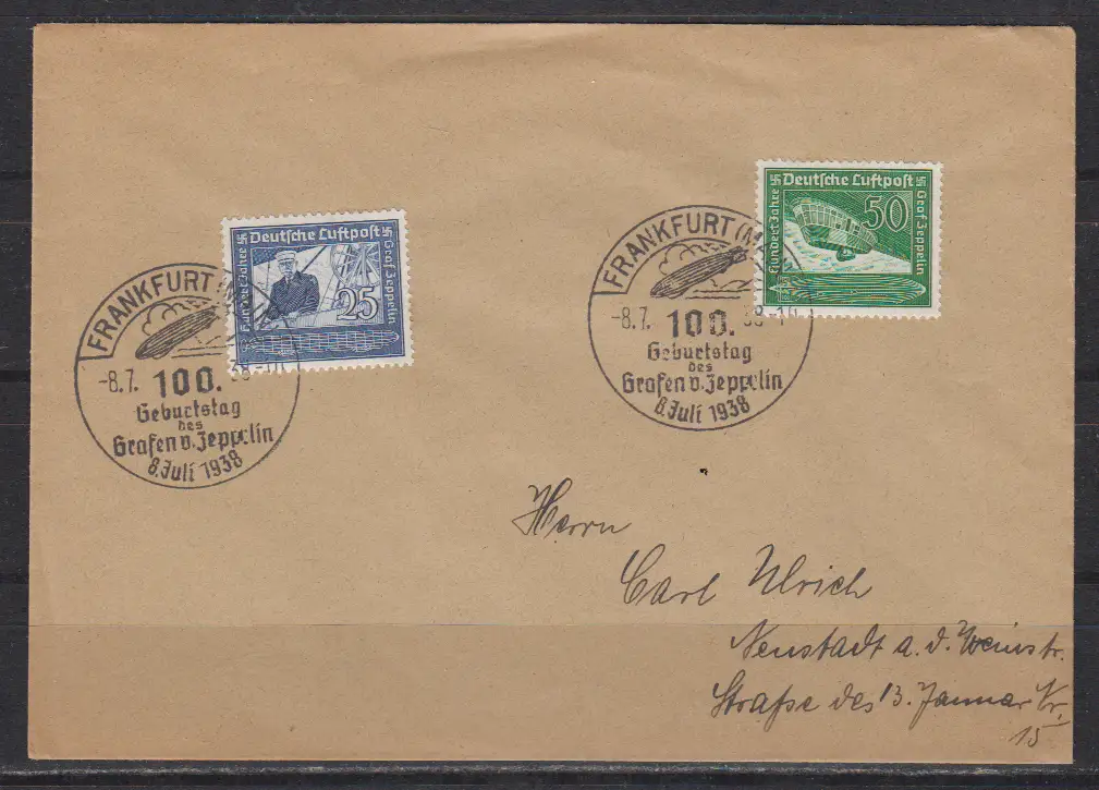Dt.Reich Ausgabe 100.Geburtstag von Ferdinand Graf von Zeppelin auf adressiertem Umschlag mit SSt Frankfurt (Main) 8.7.1938 zum Anlaß