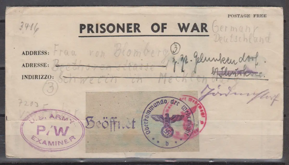 II.WK Kriegsgefangenenpost 15.8.1944 eines deutschen Soldaten Faltbrief innen Stempel : NATOUSA PWE 131/ ORAN,ALGERIA 2 nach Schwerin mit US-Zensur und OKW-Zensur , Kriegserhaltung (innen eingerissen)