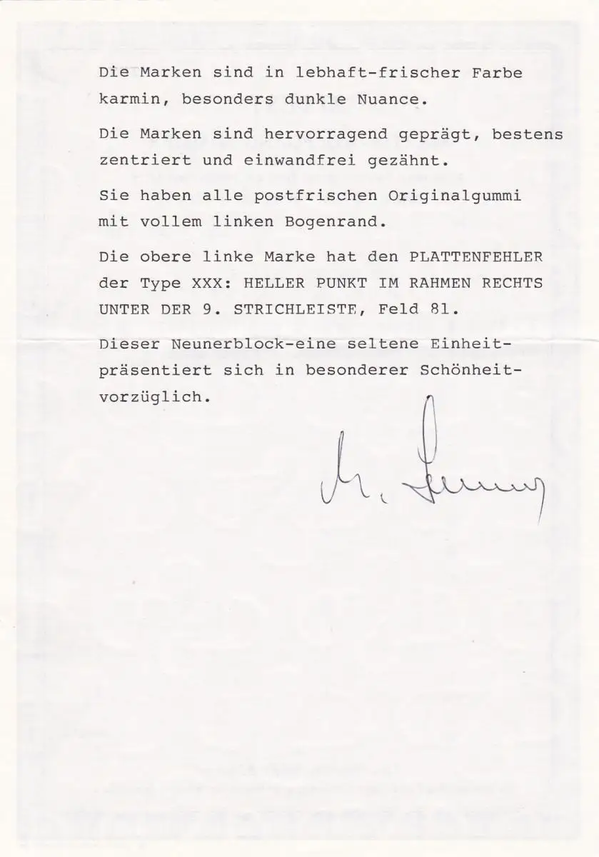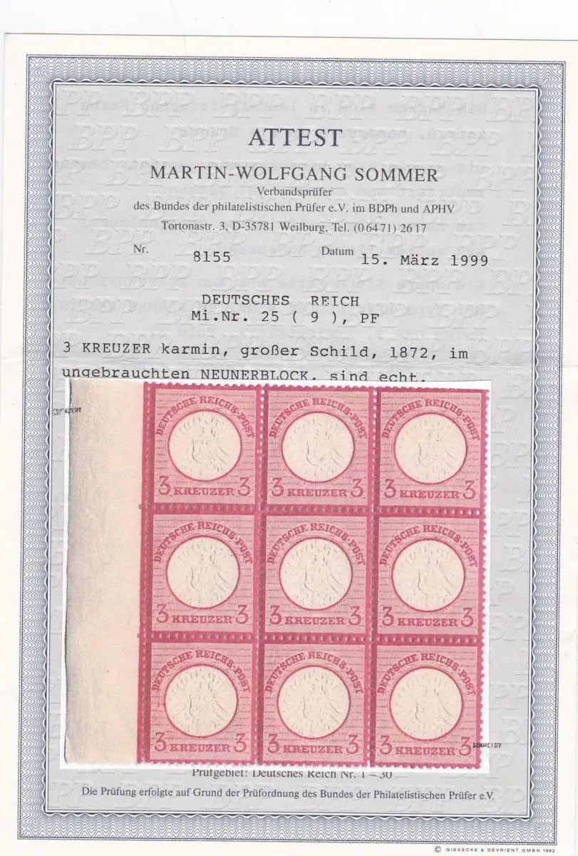 Deutsches Reich: 25 (9er Block), postfrisch, 1x Plattenfehler, BPP Attest