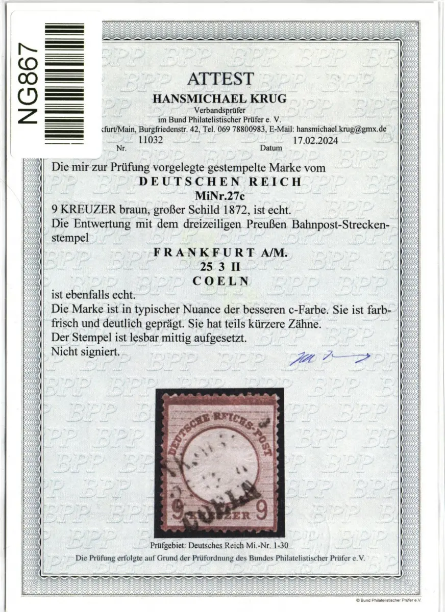 Deutsches Reich 27 c gestempelt Attest Krug BPP, leichte Mängel #NG867