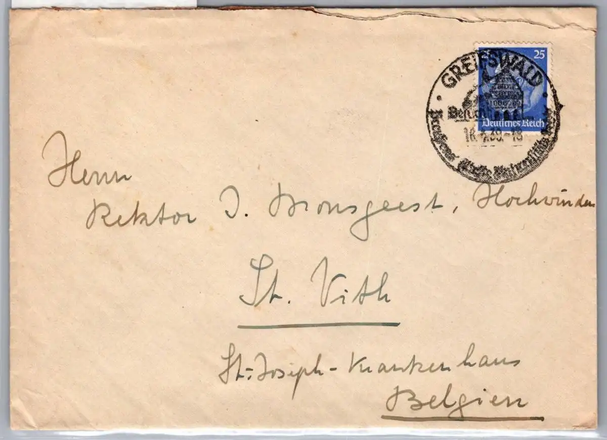 25 Pfennig Hindenburg am 16.3.1939 von Greifswald nach St. Vith Belgien gelaufen.