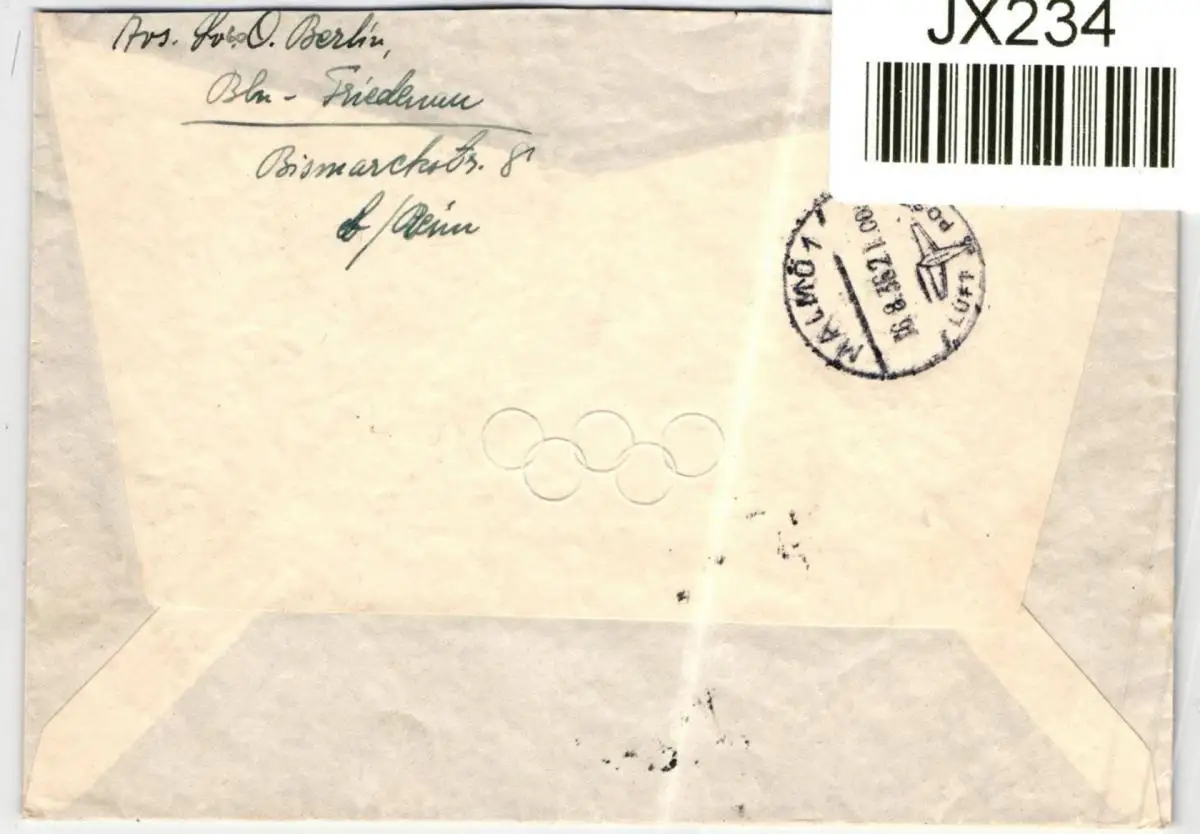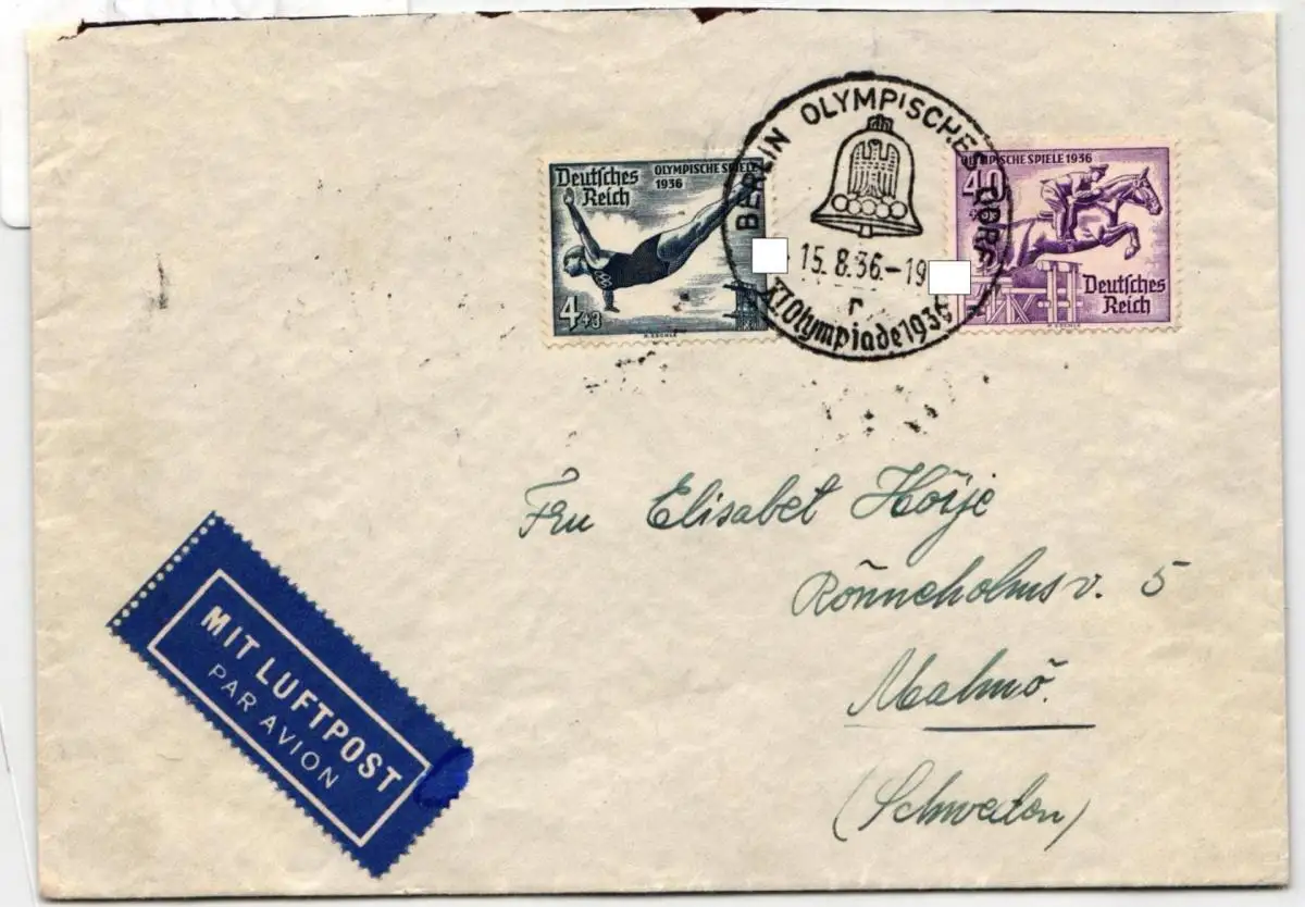 6 und 40 Pfenning "Olympische Spiele" als Mischfrankatur auf Auslands-LuPo-Brief von Berlin am 15.8.36 nach Malmö gelaufen. Sonderstempel "Berlin Olympisches-Dorf r", auf offiziellem Briefumschlag der Olympischen Spiele. Briefumschlag mit offizieller Olympia-Prägung.