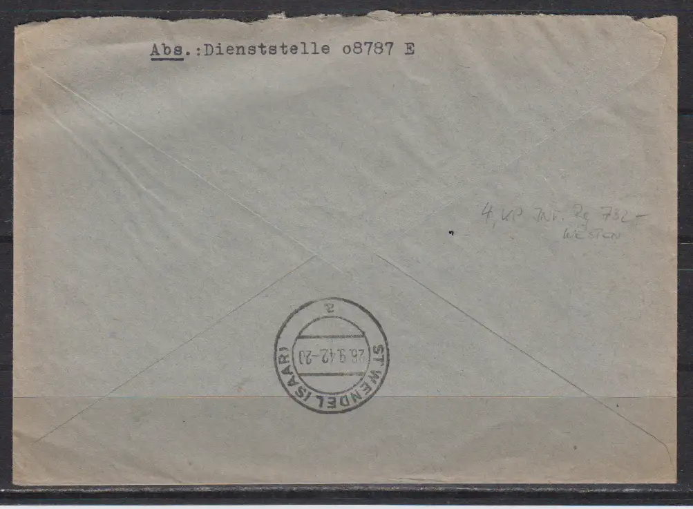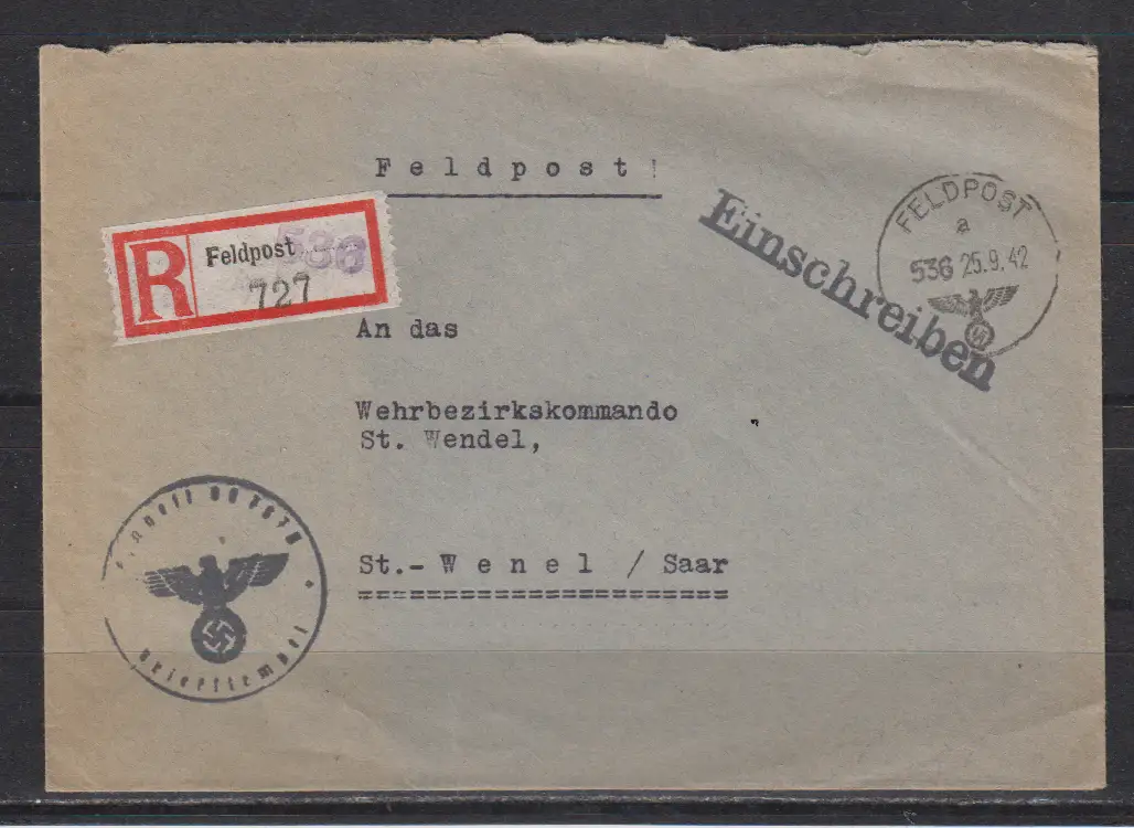 Dt.Reich R-Feldpostbrief 25.9.42 nach St.Wendel(Saar) mit FP-R-Zettel mit Kennnummer 536
