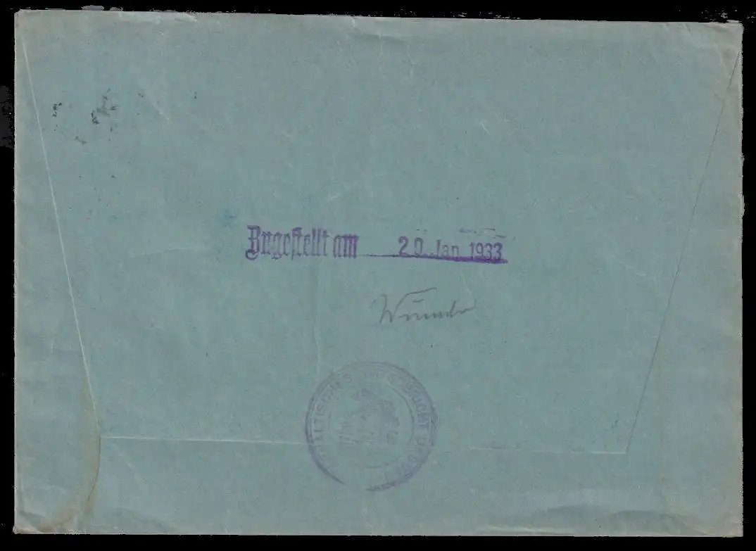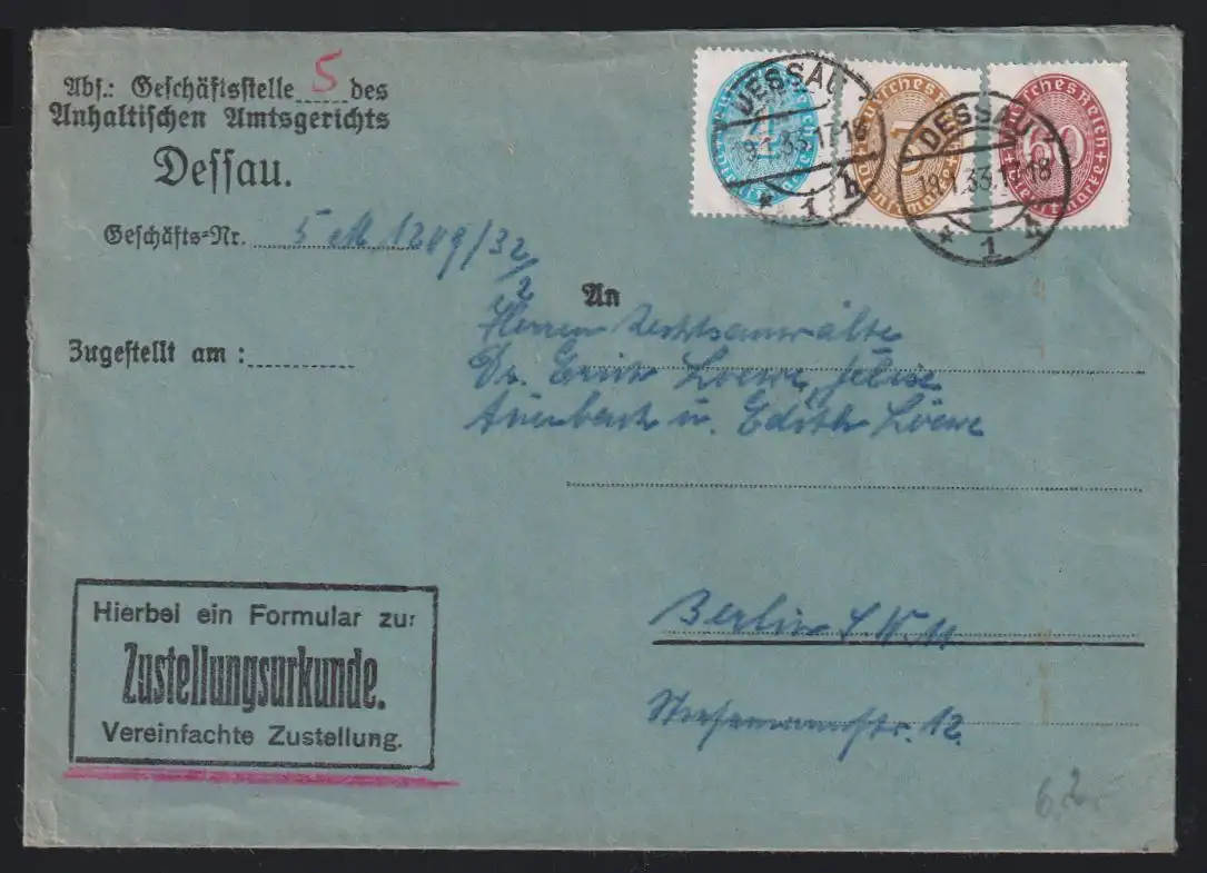 60 Pfenning, 4 und 3 Pfenning "Dienstmarken: Wertziffern im Oval" auf Zustellungsurkunde des Amtsgerichtes Dessau vom 19.1.33.