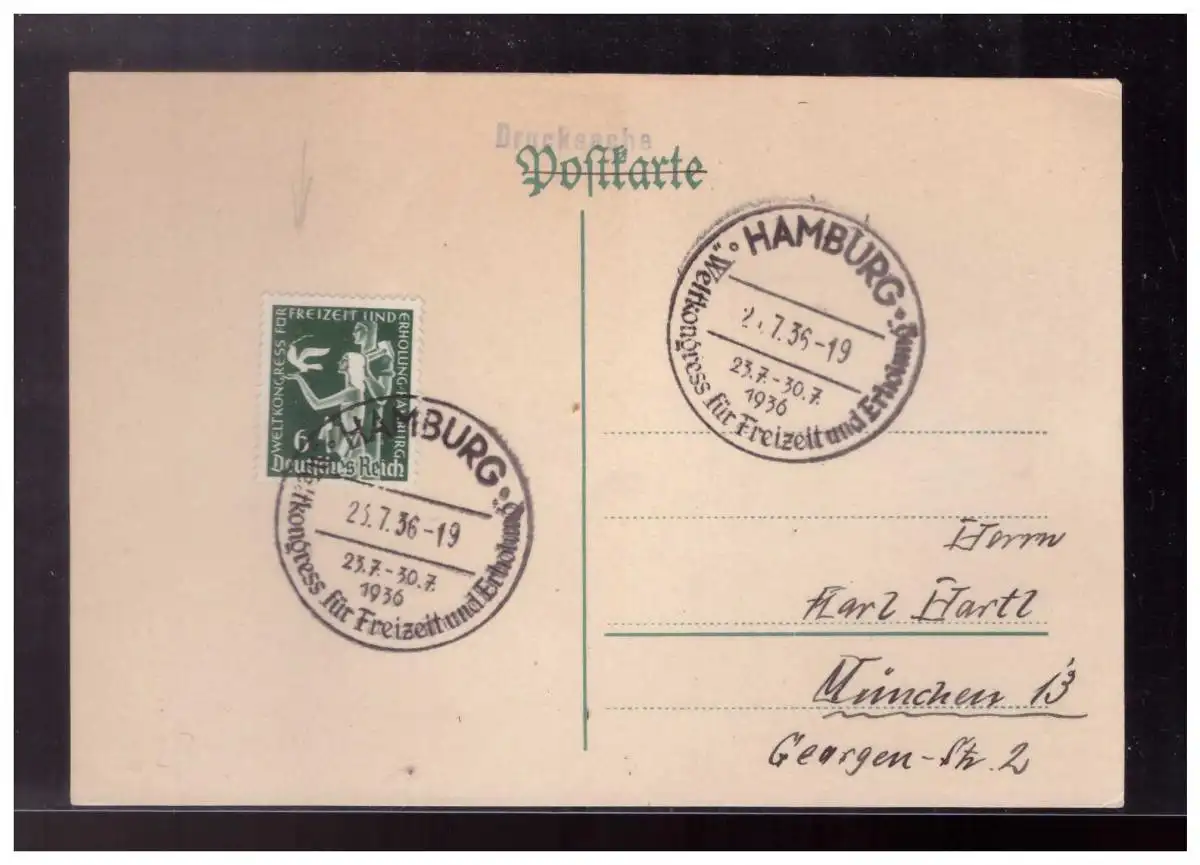 DT- Reich (023742) Postkarte mit Sonderstempel Hamburg, Weltkongress für Freizeit und Erholung vom 23.7.1936