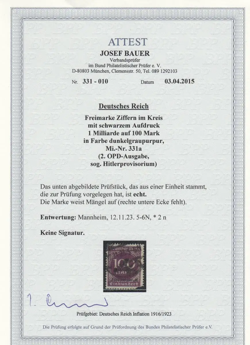 Deutsches Reich: MiNr. 331a - Provisorium, gestempelt, BPP Attest, beschädigt