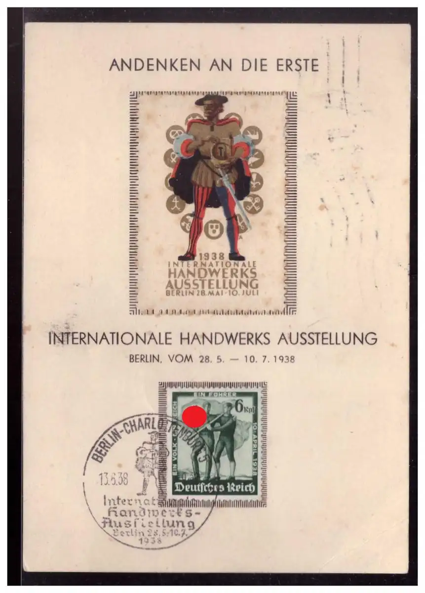 Dt- Reich (008500) Propagandakarte Andenken an die erste Internationale Handwerks Ausstellung Berlin 1938 mit SST gel.
