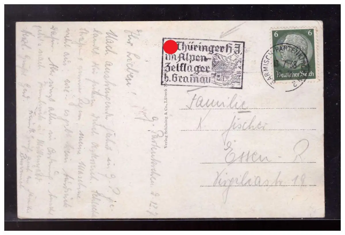 Dt- Reich (008537) Propaganda AK mit Werbestempel Thüringer HJ im Alpen- Zeltlager Grainau, gelaufen 1938