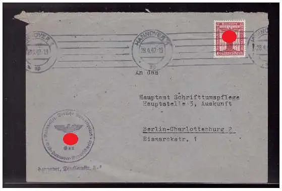 Dt- Reich (008604) Dienstbrief NSDAP Gau Hannover- Braunschweig, gelaufen Hannover am 28.4.1942