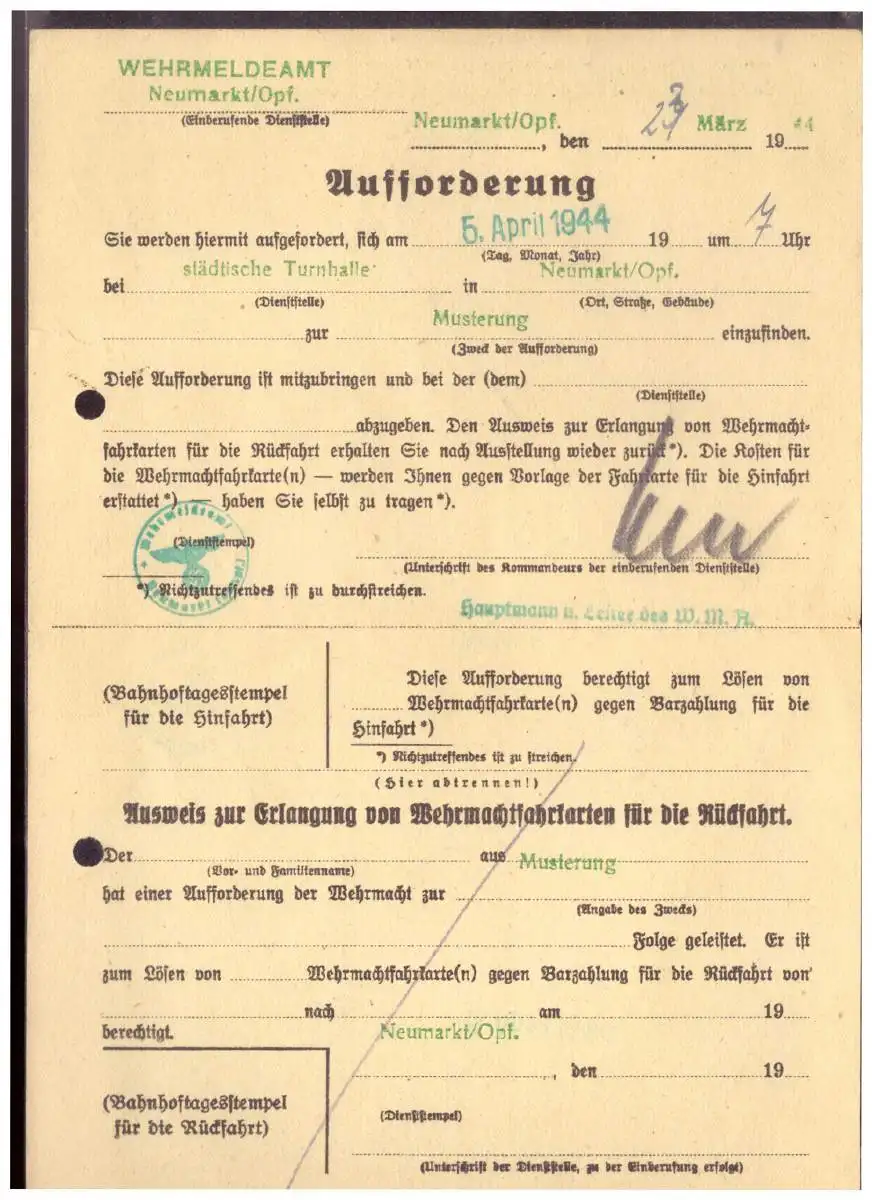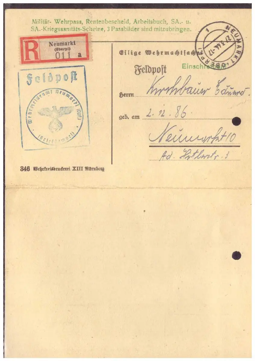 Dt- Reich (020289) Musterungs- Aufforderung Einschreiben Neumarkt zum 5.4.1944, Aktengelocht