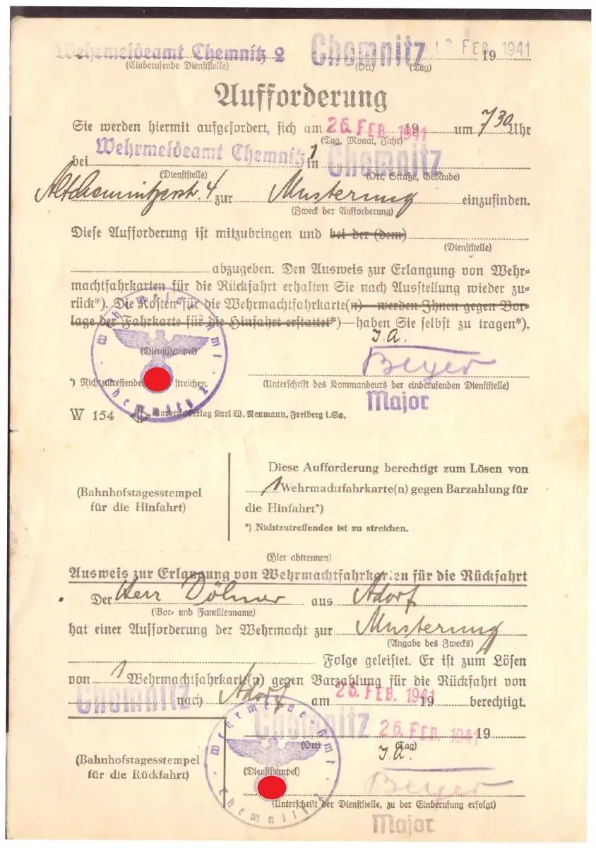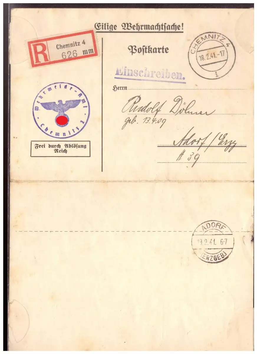 Dt- Reich (020290) Musterungs- Aufforderung Einschreiben Chemnitz zum 26.2.1941