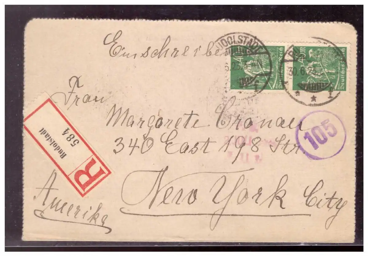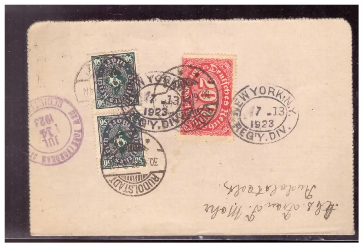 Dt- Reich (020598) Einschreiben Faltbrief mit MIF , gelaufen Rudolstadt nach New York am 30.6.1923 mit AK und Zensur