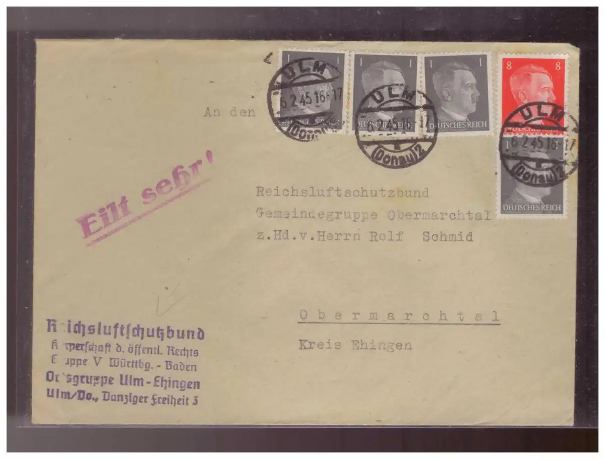 Dt- Reich (024541) Propaganda Brief mit Absenderstempel Reichsluftschutzbund Ortsgruppe Ulm Ehingen gel Ulm 5.2.1945