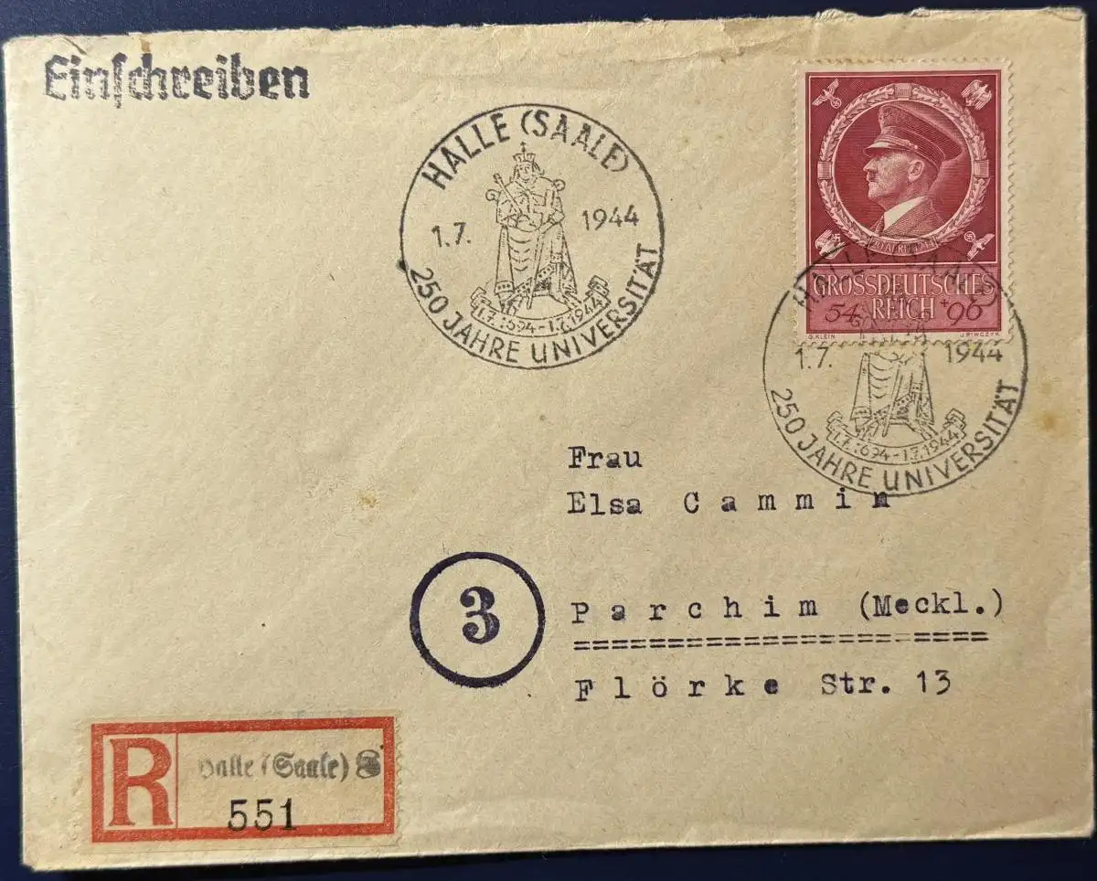 Bedarfsbrief, Deutsches (III.) Reich, Einschreiben, frankiert mit Mi.Nr. 887, gelaufen mit Sonderstempel (250 Jahre Universität Halle) vom 01.07.1944 von Halle nach Parchim. Vorder- und Rückseite leicht fleckig (siehe Scan) ansonsten sehr gut erhalten.