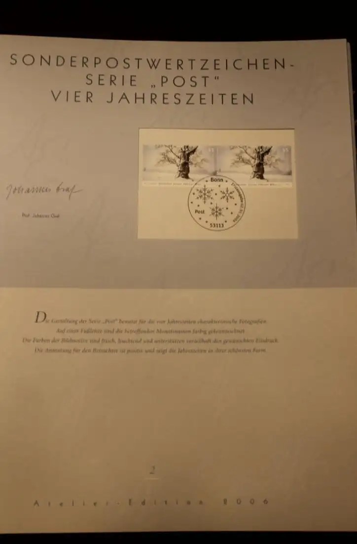 Aufwändig gestalter und hergestellter Bogen aus Kunstdruckkarton mit Leinenstruktur im Format etwas größer als DIN A4. Auf dem Doppelbogen Marke oder Block mit Ersttagsstempel, sowie die nicht angenommenen Konkurenzentwürfe. Unter der Marke befindet sich die Unterschrift (Faksimile) der Entwerfes. Diese Blätter wurden jewils nur in einer sehr kleinen Auflage von der Deutsche Post an Abonnenten abgegeben und sind somit viel seltener als ähnliche Produkte, wie die Ersttags-Sammelblätter oder privat hergestellten Künstler-Ersttagsblätter. Auf Seite 4 bzw. 6 (nicht abgebildet) eine ausführliche Beschreibung zum Anlaß.