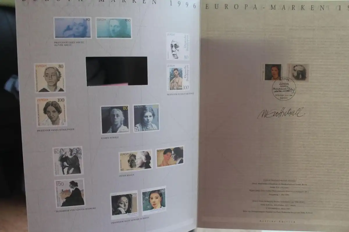 Aufwändig gestalter und hergestellter Bogen aus Kunstdruckkarton mit Leinenstruktur im Format etwas größer als DIN A4. Auf dem Doppelbogen Marke oder Block mit Ersttagsstempel, sowie die nicht angenommenen Konkurenzentwürfe. Unter der Marke befindet sich die Unterschrift (Faksimile) der Entwerfes. Diese Blätter wurden jewils nur in einer sehr kleinen Auflage von der Deutsche Post an Abonnenten abgegeben und sind somit viel seltener als ähnliche Produkte, wie die Ersttags-Sammelblätter oder privat hergestellten Künstler-Ersttagsblätter. Auf Seite 4 bzw. 6 (nicht abgebildet) eine ausführliche Beschreibung zum Anlaß. Weiterhin finden sie technische Angaben zur Marke.