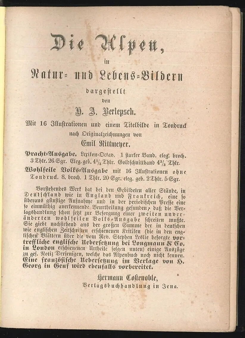 Jena, Costenoble 1866. 3. Aufl. für den Reisegebrauch redigirt. 5 Bll., VI, 286 S., 9 Bl. Mit 6 Taf. in Holzstich nach Zeichn. v. Emil RITTMEYER. OLn. m. goldgepr. Deckeltitel. Stellenw. stockfl., sonst in sehr gutem Zustand.