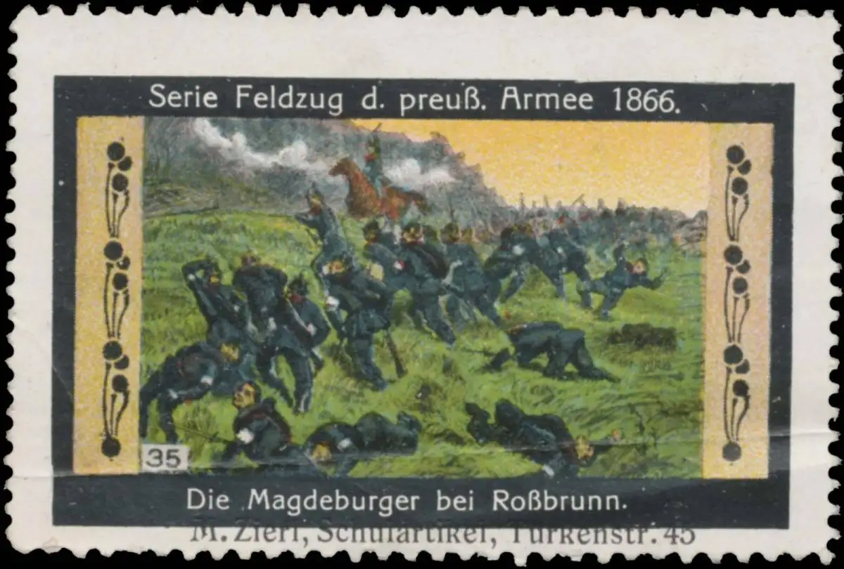 Serie: Feldzug der preußischen Armee 1866, Bild 35, M. Zierl Schulartikel, Türkenstraße 45, Größe/Zustand: 4x6 , leicht geknickt, Original alte Reklamemarke die seinerzeit für die Werbung benutzt wurde