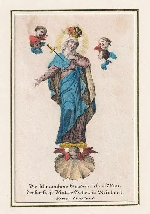 Bemerkungen: Dargestellt ist die Gnadenstatue der "Schmerzhaften Muttergottes", das sich heute in der Rokoko-Kirche von Maria Steinbach/Legau in Bayern befindet. Ursprünglich war die Statue in einer kleinen Wegkapelle aufgestellt. Aufgrund der großen Pilgerströme entschied man sich 1749 schließlich für einen Neubau der Kirche.