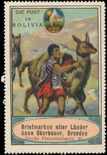 Bolivien, Briefmarken aller Länder, Große Plauenschestraße 31, Größe/Zustand: 7x5 , guter Zustand, Original alte Reklamemarke die seinerzeit für die Werbung benutzt wurde