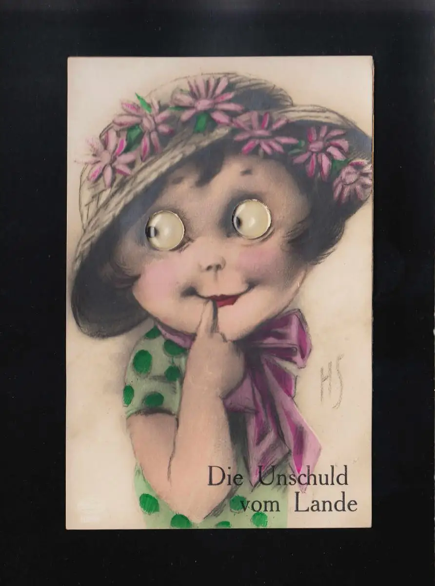 Die Unschuld vom Lande, Mädchen Hut Blumen, bewegliche Augen, beschriftet