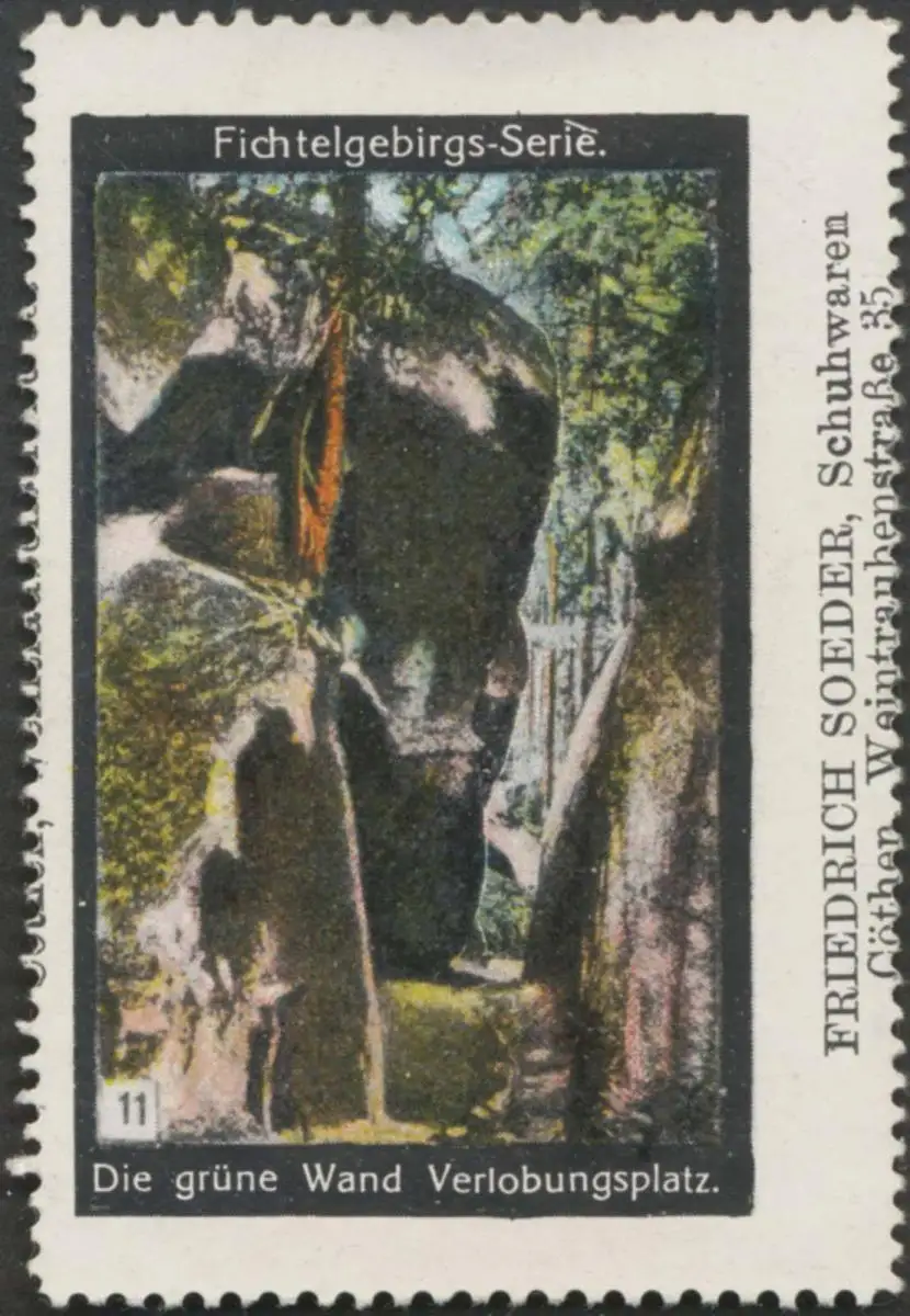 Fichtelgebirgs-Serie, 11, Friedrich Soeder, Schuhwaren, Cöthen, Weintraubenstraße 35, Größe/Zustand: 7x5 , guter Zustand, Original alte Reklamemarke die seinerzeit für die Werbung benutzt wurde